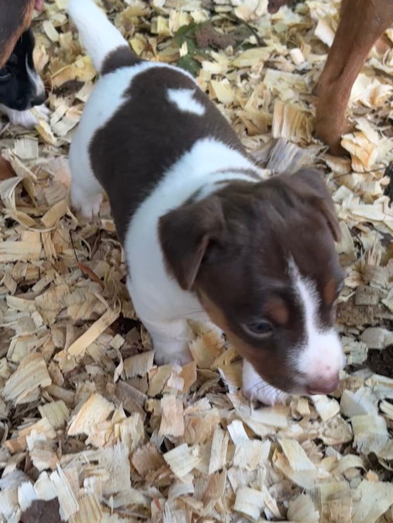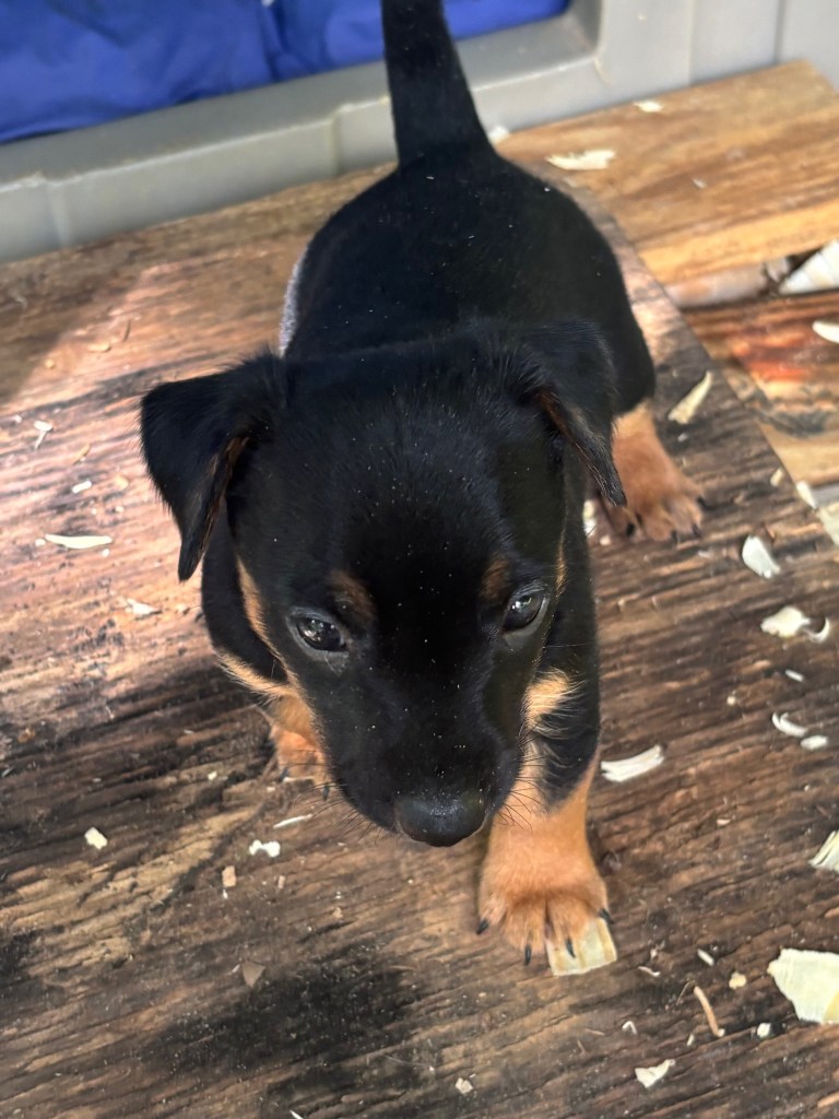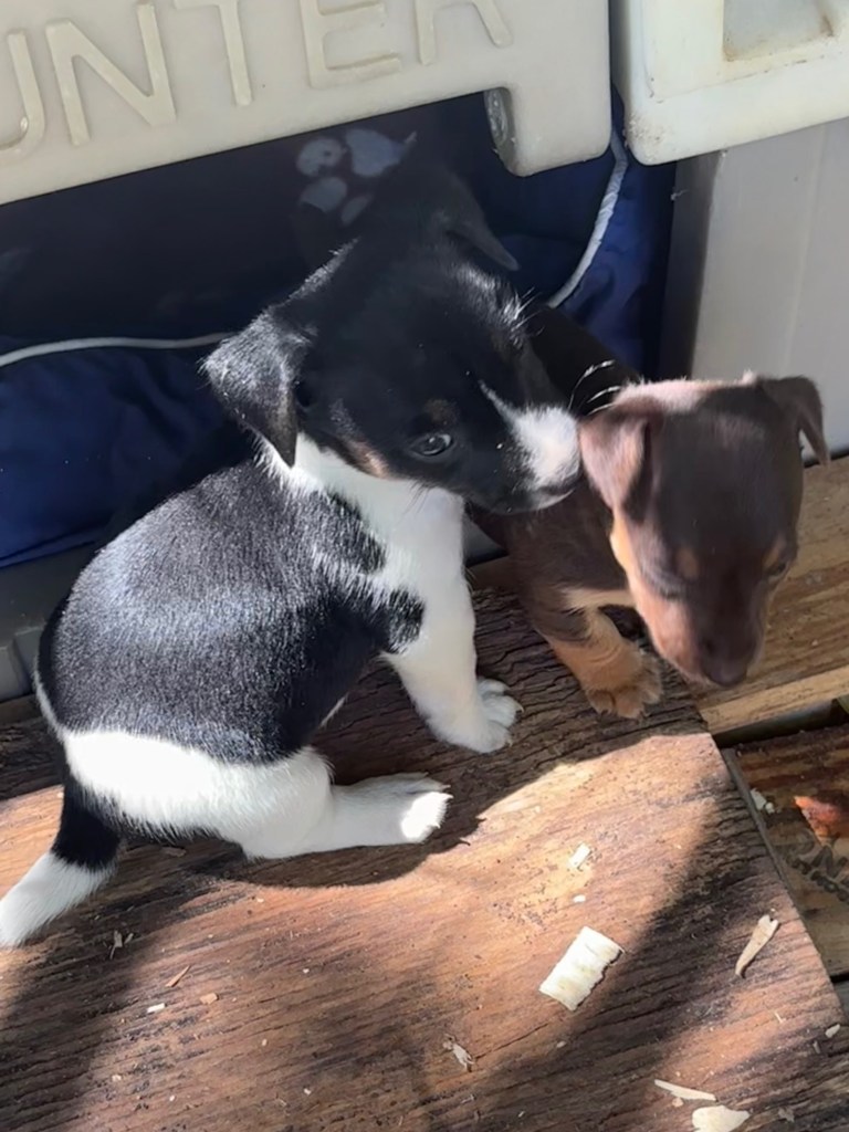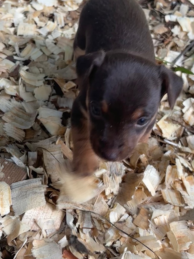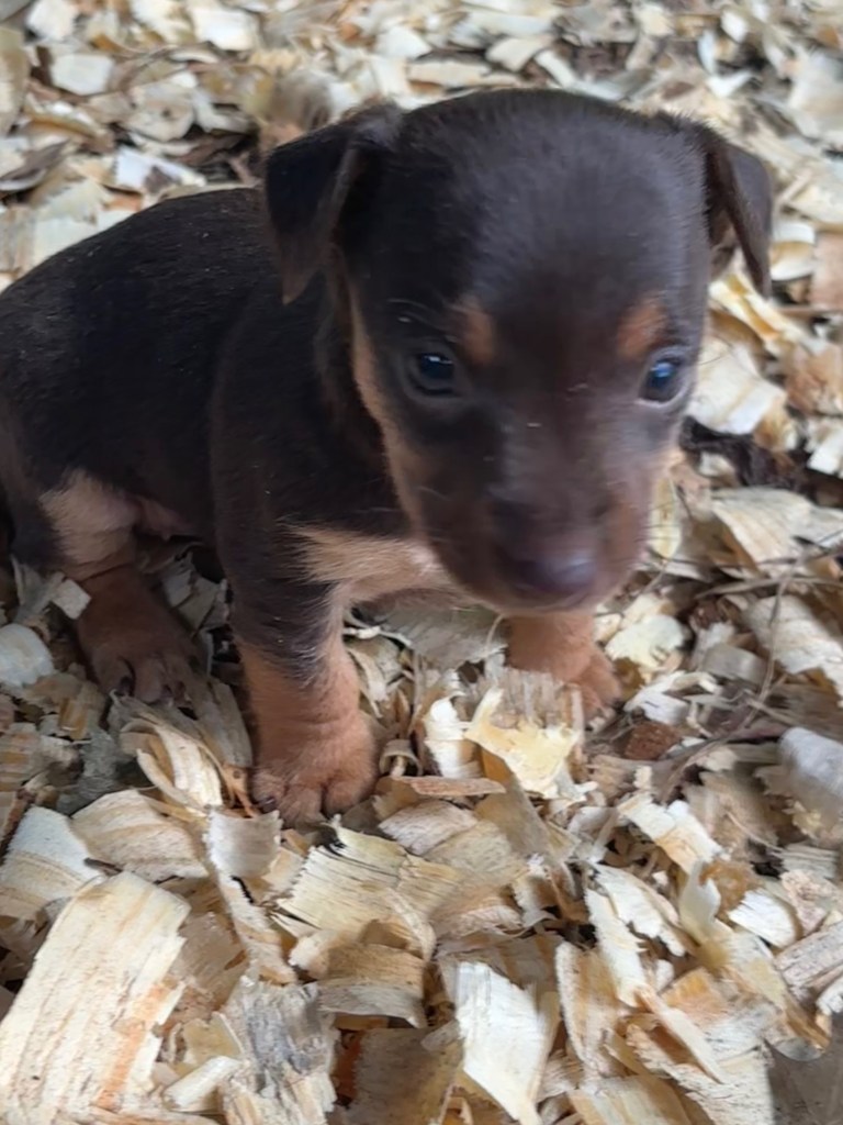 The five pups were born on August 23,2025. We have one black & tan female, Esme, and her chocolate & tan sister, Elodie. We also have 3 males, one black & tan, with white, Elvis, and two chocolate & tan with white, Eddie & Enzo.